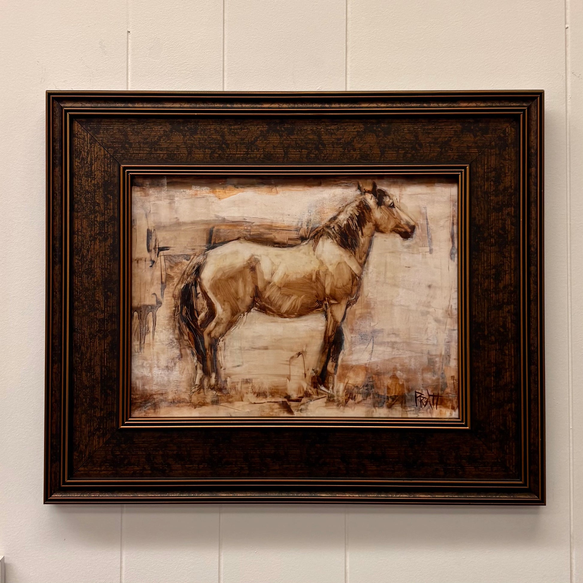 Restless is inspired from this summer's Kiger Valley ride to see Oregon's wild Kigers. This was a lone bachelor stallion, hanging on the outskirts of a larger herd. Perhaps awaiting his opportunity to form his own band. Close up you will see my reductive techniques, and hints of my initial sketch. I enjoying allowing the history of the process to come through. I resisted the urge to layer more colour into this painting, allowing a monochromatic sepia and umber theme to shine.